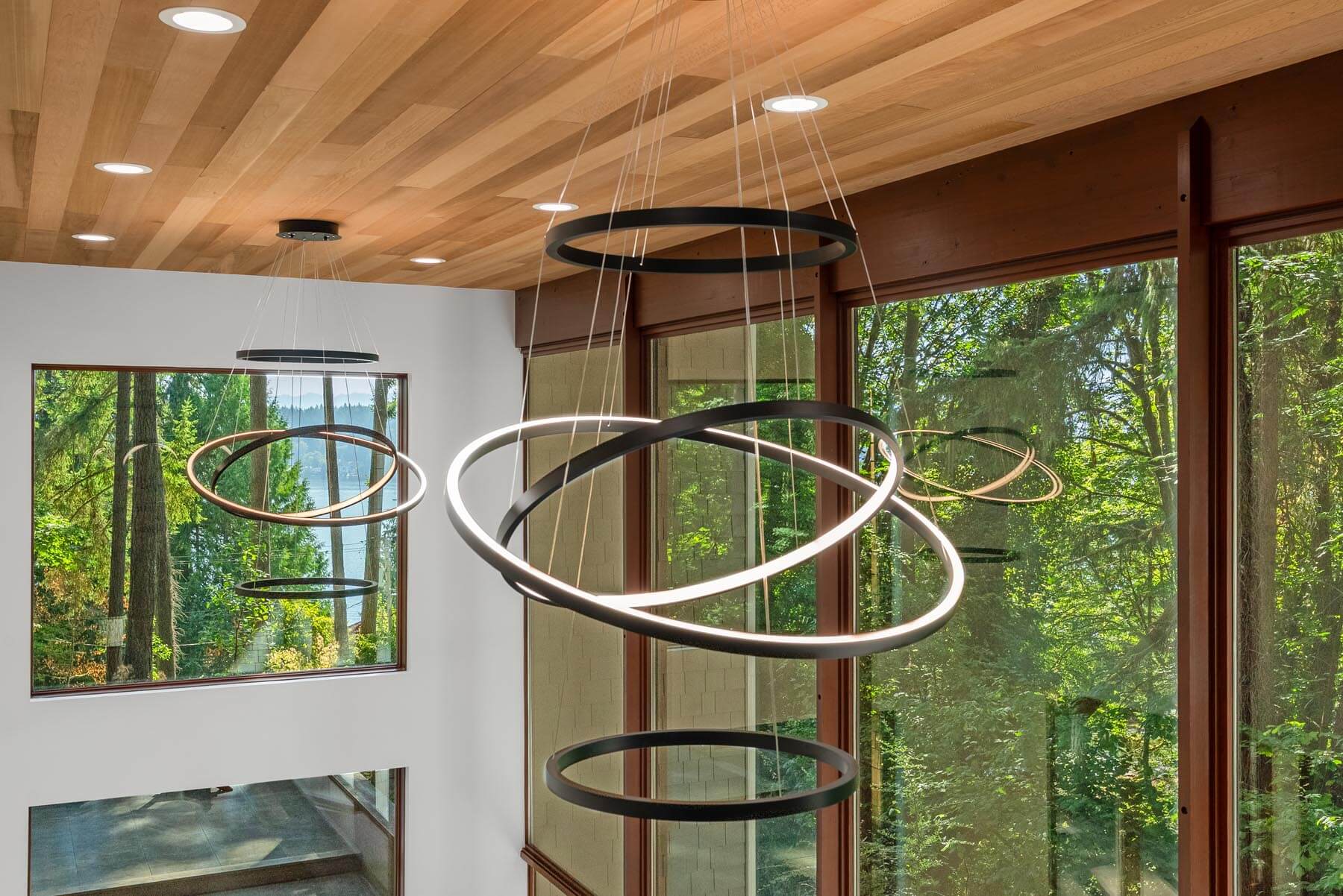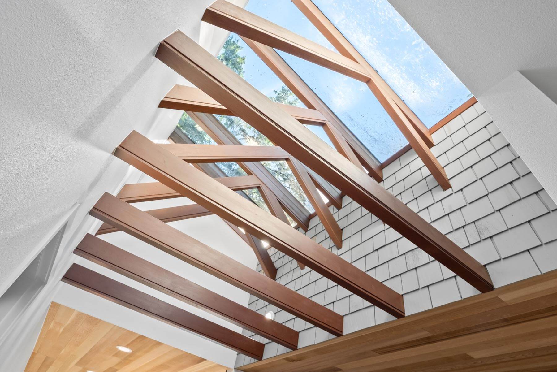 Large windows and open sightlines were preserved wherever possible, allowing daylight to continue flowing throughout the interior. Similarly, several original architectural materials — including siding and cedar ceiling details — were carefully maintained as part of the renovation. These elements add warmth and texture to the home while grounding the updated design in its original character.