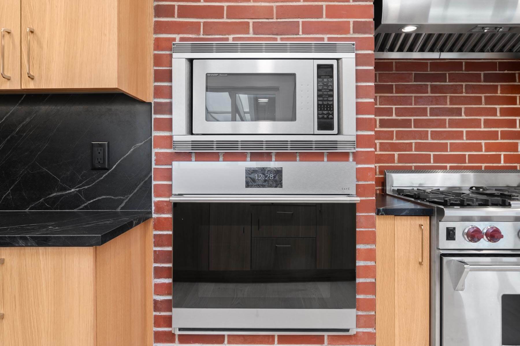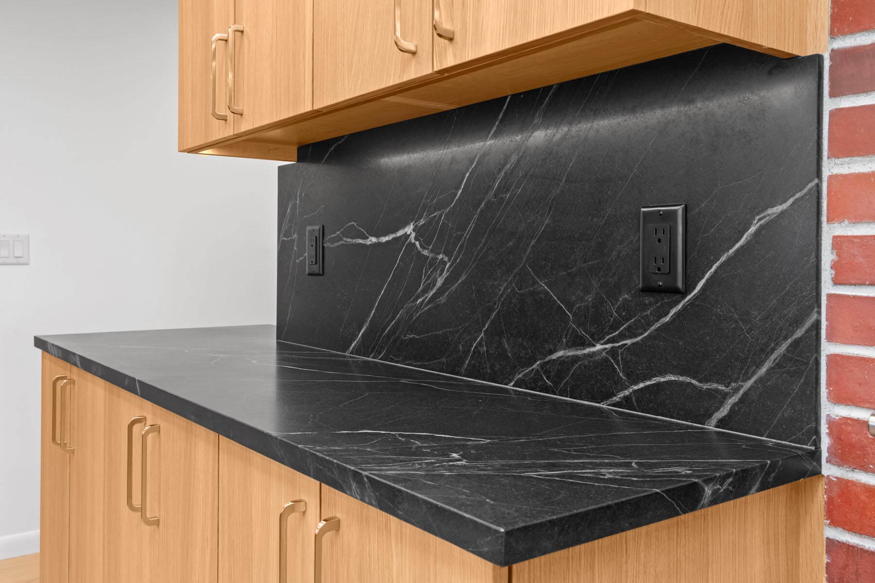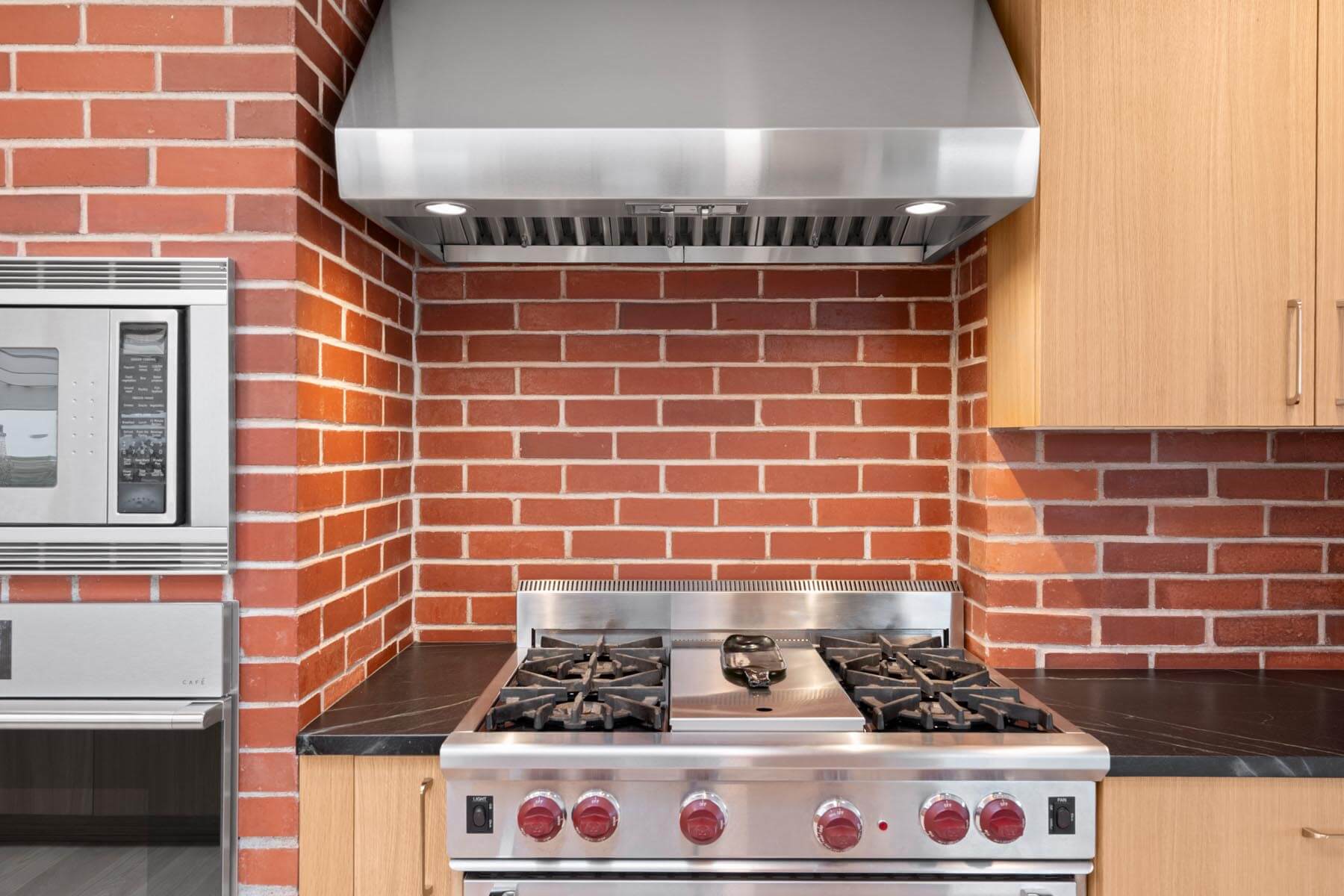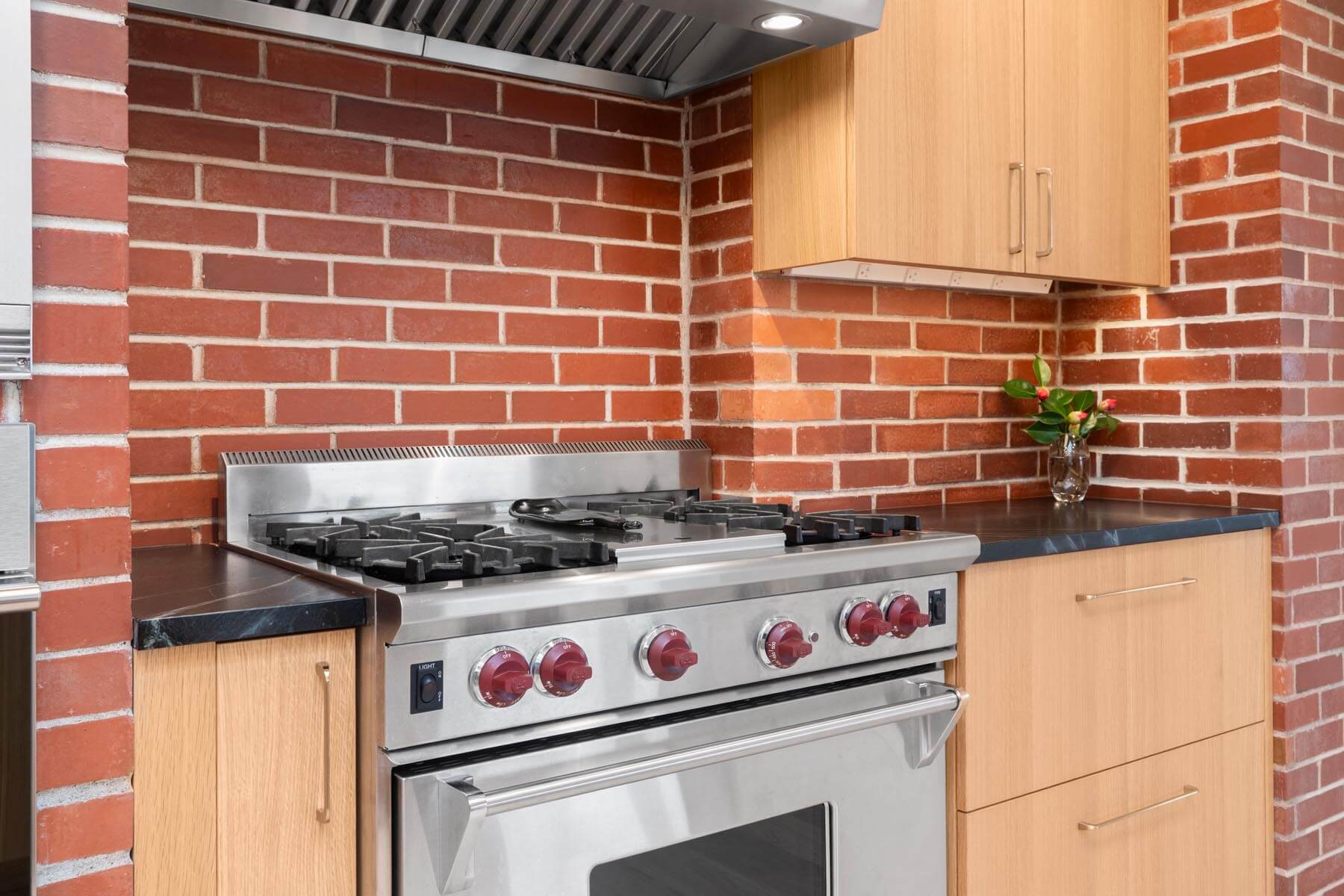 Cabinetry was carefully designed to maximize storage without overwhelming the space while coordinating well with the original brick in a portion of the kitchen. Thoughtful configurations ensure that everything has a designated place, helping the kitchen remain organized even during busy family routines.