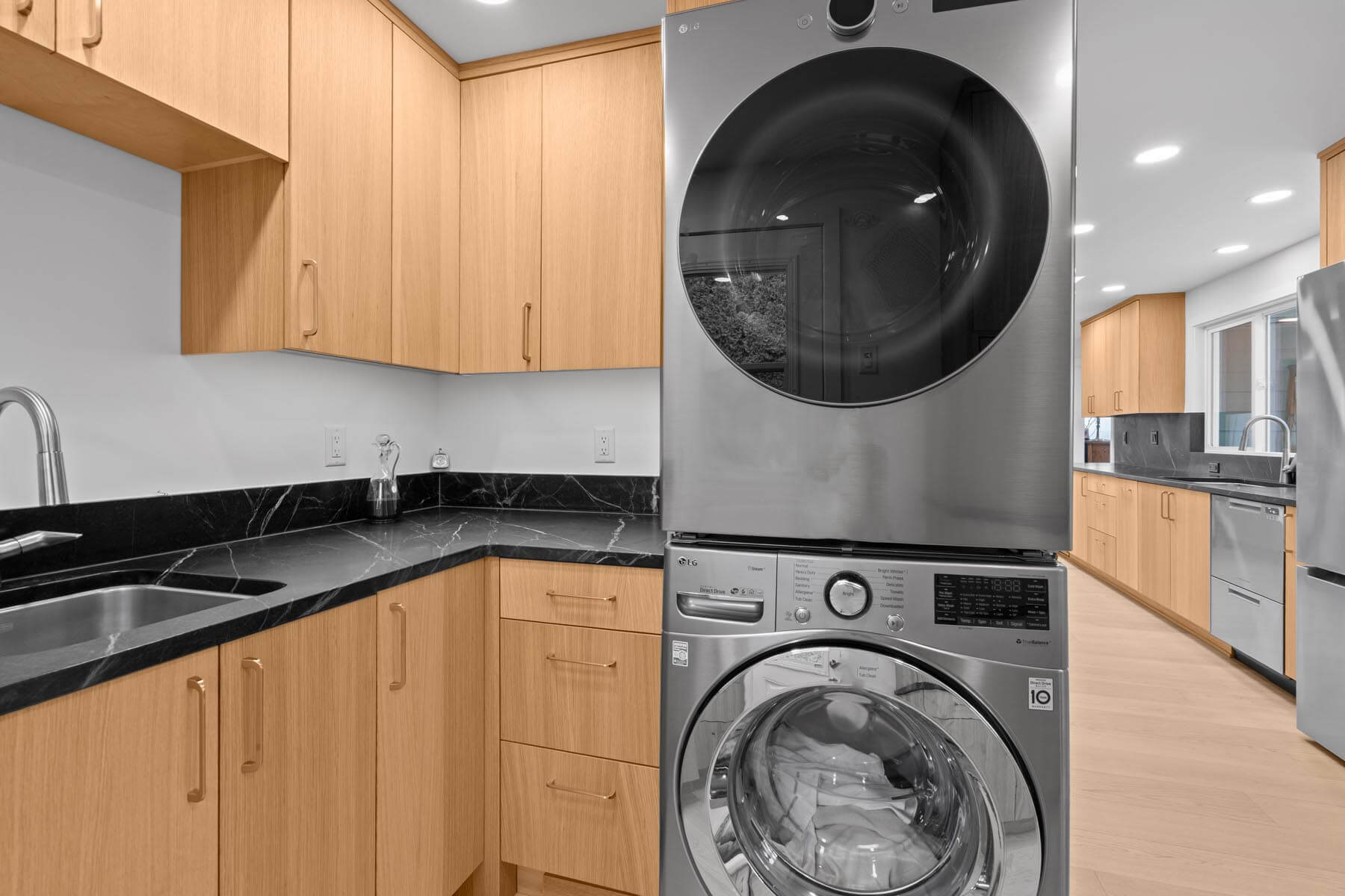 The redesigned laundry space offers improved storage solutions and a more logical layout, making everyday tasks easier to manage. Cabinets and shelving provide dedicated areas for detergents, cleaning supplies, and household essentials.