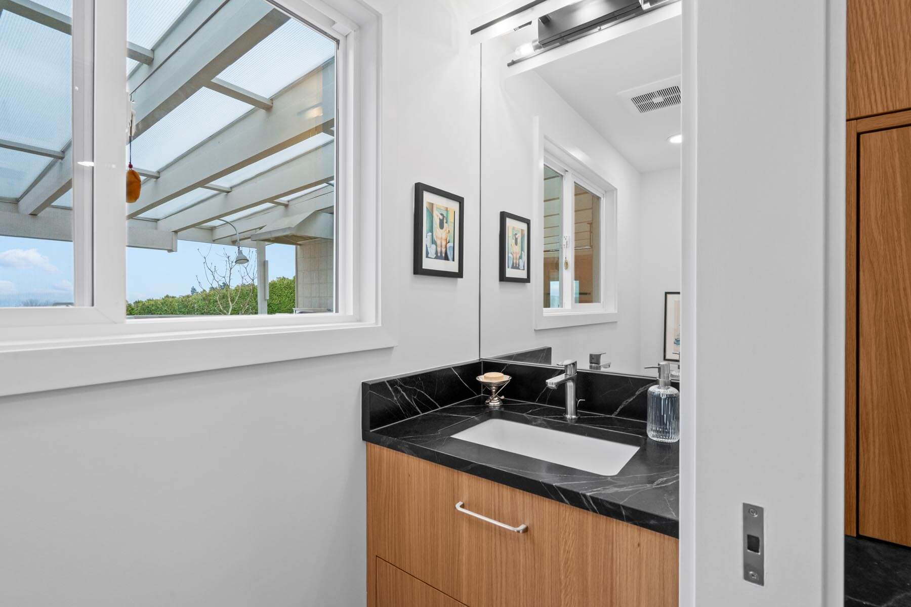 Through careful planning, the powder bath was redesigned to feel more comfortable and visually balanced while maintaining its compact footprint. Updated fixtures and finishes contribute to a clean, modern aesthetic, while thoughtful layout adjustments improve circulation within the room.